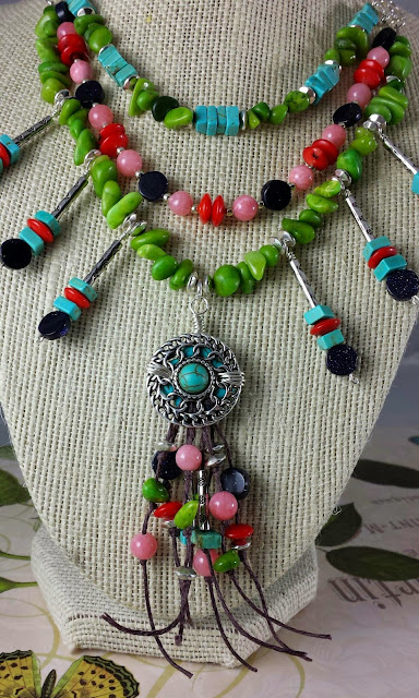 There were a couple of things that I could not find so I had to tweak the materials a bit. But in the end all of the colors were there. I thought the colors were a bold mixture so I went with a bold three stand necklace. I went back and forth on what to place as the middle pendant and actually started working with the waxed linen thinking I was starting from scratch on an entirely new piece. In the end, I thought that the medallion with waxed linen tassels added a natural element to the necklace that I thought was missing.